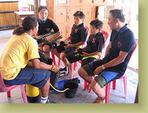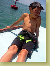 ブリーフィングは、英語。水中でなにか困ったことがあったときは手を波打たせるとか、浮上・潜行のシグナルとか。緊張の面持ちで、説明に聞き入る翼と樹。ミミ抜きの練習をするも、鼻をかむのが上手な樹はOKなのですが、翼は??? ちょっと顔がこわばる・・・ 各自にあったサイズの、ウェットスーツとシュノーケルを選んでもらいます。でも、やはり9歳の樹にぴったりのスーツはなくって、ちょっとぶかぶか。所々擦り切れたウェットを着て海を眺める様子は、いや〜なかなか海の男っぽくてかっこいい、でしょ!? ボートで沖に出たのは、10分くらいかしら(もう少し短かったかな)という距離。タンクも背負わずに、マスクとフィンだけ付けて、翼と樹は海に入ってから、BC(タンクを装着したジャケット)を着せてもらって、殿様ダイビングです。 |