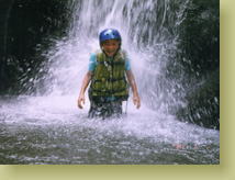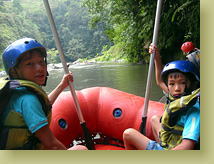 緩やかな流れのところでは、川から渓谷の上にそびえるホテルを見上げる余裕も。ガイドが「あそこは日本人がオーナーなんだよ」とか、解説してくれます。翼と樹は大きなアメンボを捕まえていました。 最後は台湾チームとレースです。競争となると俄然もえちゃうお子ちゃま、速い速い。8km 2時間ほどかけての、とっても楽しい川下りでした。 |