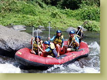 濡れては困るものは、防水袋に入れてくれて、ゴムボートに乗り込みます。ぼよんぼよん・・・水は透明ではありませんが、緑色でなんとなく探検気分。 ワヤンさんは、上手に日本語で挨拶。「ようこそ、アユン川のラフティングへ。この会社は、バハマ。またバリ島に来たら、バハマのワヤンさんを覚えていてね(^_-)-☆」と。 オールの持ち方、漕ぎ方、急流での体勢など説明をうけ、いよいよ出発です。 |