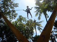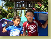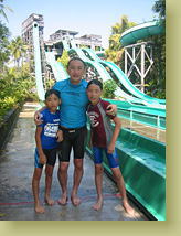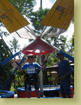 エレベータがあるわけではないので、そうです、滑り降りるためには、その高さまで、階段を登るのです! 大きな浮き輪をもったり、ブギーボードをもったりして、えっちらおっちら。何回登ったことやら。 ずっと裸足で、濡れては走って次ぎのスライダーへと向かうので、だんだんと足の裏がふやけて、痛くなってくる(ツボ刺激状態) 2人並んで滑ることができるコースでは、Ready GO!と競争。スタート地点にはモニターTVが付いていて、前の人が着水したかを見ることができるようになっているので、Rue.vs.翼 の結果を確認してから、JUNTA.vs.樹がスタート、なんていう具合。 身長制限があったのは、スマッシュダウン だけだったかな。120cmくらい、TDLのようにラインを超えているかのチェックです。 園内には、もちろんプールもあって、デッキチェアで大人は休憩タイムも取りましたが、その間も、翼と樹はとにかく、登る&滑りまくり。 やっととらせたランチ(なかなか美味しかったです)の後の食休み、と思ったら、テラスの横でバンジージャンプをやってて、Tryすることに。 |