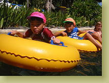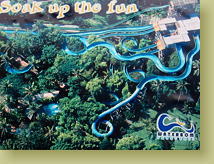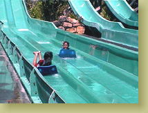 まずは運河のように園内を巡る川を、ゆったりと大きな浮き輪で楽しむ【レイジーリバー】。熱帯ムード満点の中、の〜んびり、でも時々、小便小僧ならぬ小便おサルから滝の水を浴びたり、自分では行く方向を制御できないので、ぷかぷかきゃーきゃー楽しいのです。 この浮き輪に乗って、トンネルの中を回転しながら滑り降りるのが【マカロニチューブ】。これ最高です。 |
