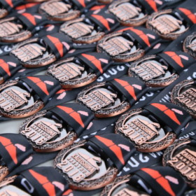 大会受付して、おもてなし会場でパチリ。おおお、目標タイムはサブ4でござるか。