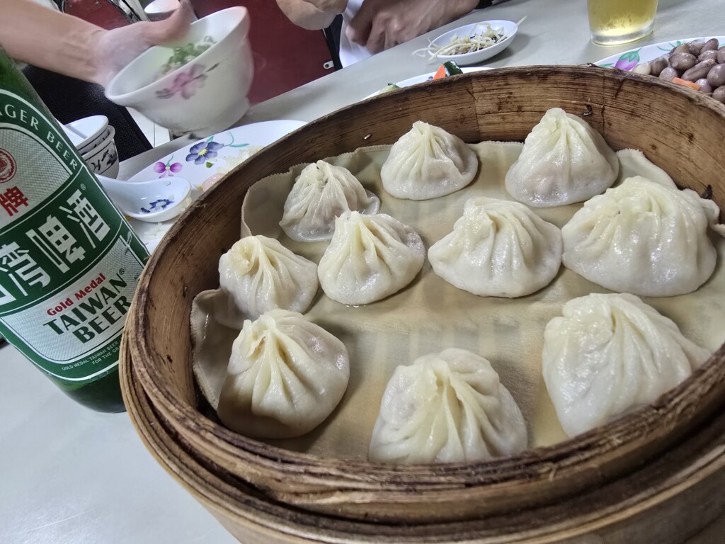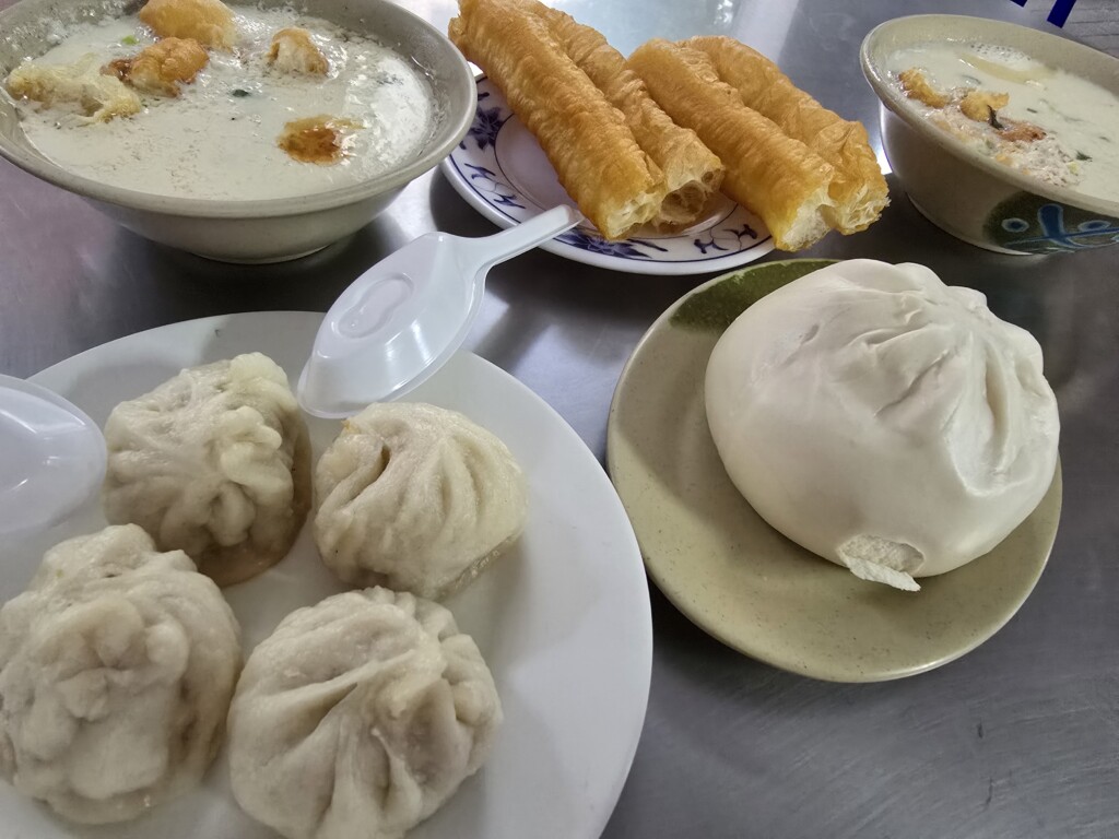 団地の一角みたいな場所。冰・溫・熱を選んでいただく 柔らかい鹹豆漿がとにかく するんぷるん、浮かせた油條も最高です。小籠包と肉まんもいっちゃいました
