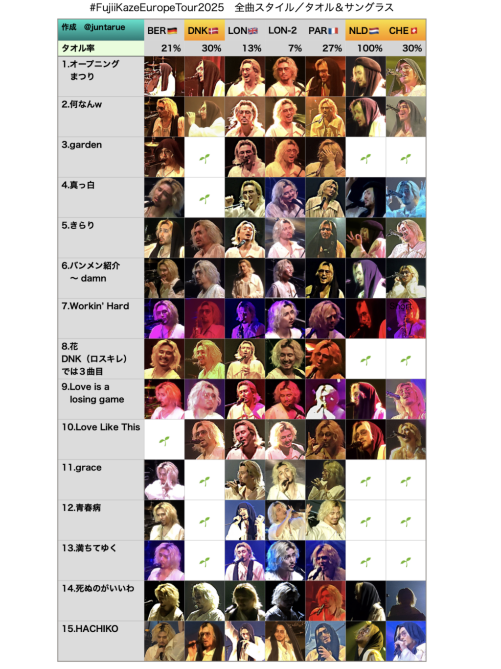 これまでのアジア/USライブは、都市・日毎に色違いの衣装や被り物で変化つけたりがありましたが、Europeツアーは基本 同じ白い衣装。ですが「タオル着用・ときにベレー帽」の変化が面白かった。全曲一覧してみました
